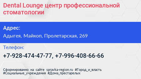 Dental Lounge, центр профессиональной стоматологии по адресу Адыгея, Майкоп, Пролетарская, 269 в дальнейшем Организация, размещена в следующих категориях: