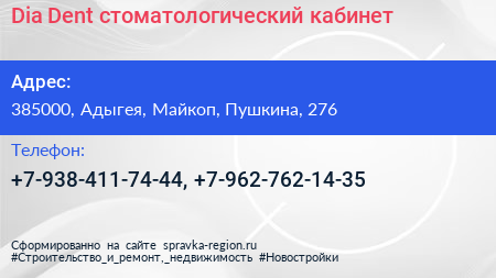 Dia Dent, стоматологический кабинет по адресу 385000, Адыгея, Майкоп, Пушкина, 276 в дальнейшем Организация, размещена в следующих категориях: