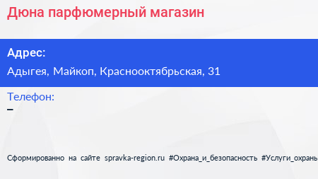 Дюна, парфюмерный магазин по адресу Адыгея, Майкоп, Краснооктябрьская, 31 в дальнейшем Организация, размещена в следующих категориях: