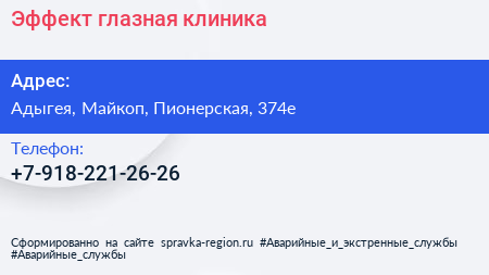 Эффект, глазная клиника по адресу Адыгея, Майкоп, Пионерская, 374е в дальнейшем Организация, размещена в следующих категориях: