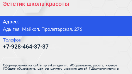 Эстетик, школа красоты по адресу Адыгея, Майкоп, Пролетарская, 276 в дальнейшем Организация, размещена в следующих категориях: