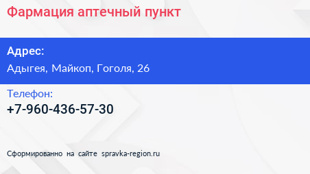 Фармация, аптечный пункт по адресу Адыгея, Майкоп, Гоголя, 26 в дальнейшем Организация, размещена в следующих категориях: