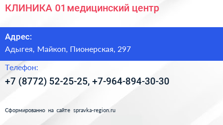 КЛИНИКА 01, медицинский центр по адресу Адыгея, Майкоп, Пионерская, 297 в дальнейшем Организация, размещена в следующих категориях: