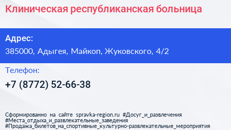 Клиническая республиканская больница по адресу 385000, Адыгея, Майкоп, Жуковского, 4/2 в дальнейшем Организация, размещена в следующих категориях: