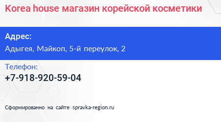 Korea house, магазин корейской косметики по адресу Адыгея, Майкоп, 5-й переулок, 2 в дальнейшем Организация, размещена в следующих категориях: