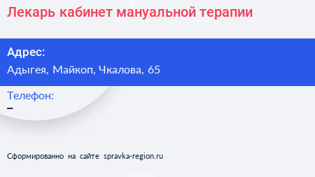 Лекарь, кабинет мануальной терапии по адресу Адыгея, Майкоп, Чкалова, 65 в дальнейшем Организация, размещена в следующих категориях: