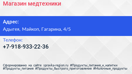Магазин медтехники по адресу Адыгея, Майкоп, Гагарина, 4/5 в дальнейшем Организация, размещена в следующих категориях: