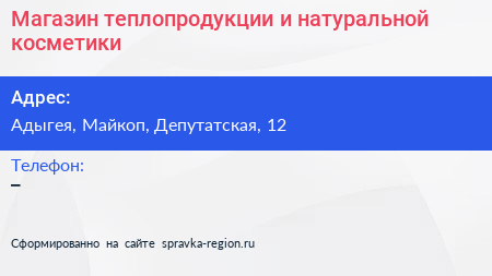 Магазин теплопродукции и натуральной косметики по адресу Адыгея, Майкоп, Депутатская, 12 в дальнейшем Организация, размещена в следующих категориях:
