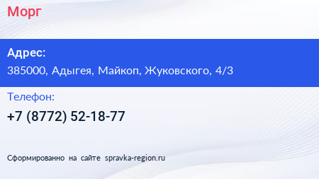 Морг по адресу 385000, Адыгея, Майкоп, Жуковского, 4/3 в дальнейшем Организация, размещена в следующих категориях:
