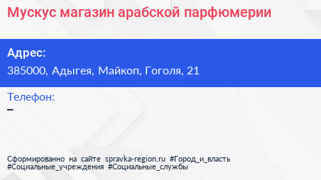 Мускус, магазин арабской парфюмерии по адресу 385000, Адыгея, Майкоп, Гоголя, 21 в дальнейшем Организация, размещена в следующих категориях: