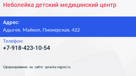 Неболейка, детский медицинский центр по адресу Адыгея, Майкоп, Пионерская, 422 в дальнейшем Организация, размещена в следующих категориях: