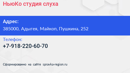 НьюКо, студия слуха по адресу 385000, Адыгея, Майкоп, Пушкина, 252 в дальнейшем Организация, размещена в следующих категориях: