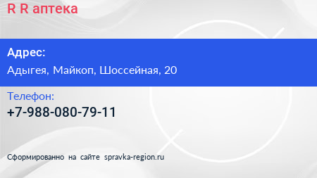R & R, аптека по адресу Адыгея, Майкоп, Шоссейная, 20 в дальнейшем Организация, размещена в следующих категориях: