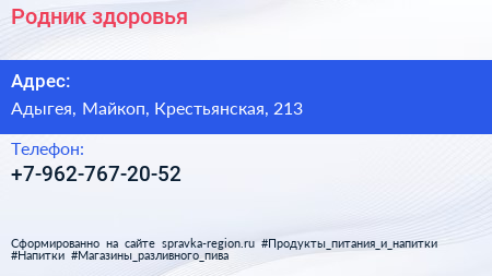 Родник здоровья по адресу Адыгея, Майкоп, Крестьянская, 213 в дальнейшем Организация, размещена в следующих категориях: