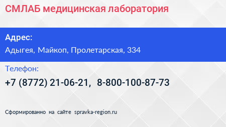 СМЛАБ, медицинская лаборатория по адресу Адыгея, Майкоп, Пролетарская, 334 в дальнейшем Организация, размещена в следующих категориях: