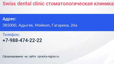 Swiss dental clinic, стоматологическая клиника по адресу 385000, Адыгея, Майкоп, Гагарина, 26а в дальнейшем Организация, размещена в следующих категориях: