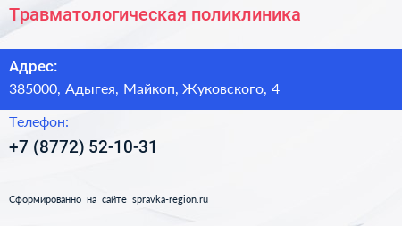 Травматологическая поликлиника по адресу 385000, Адыгея, Майкоп, Жуковского, 4 в дальнейшем Организация, размещена в следующих категориях: