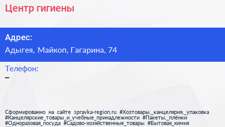 Центр гигиены по адресу Адыгея, Майкоп, Гагарина, 74 в дальнейшем Организация, размещена в следующих категориях: