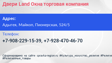 Двери Land & Окна, торговая компания по адресу Адыгея, Майкоп, Пионерская, 524/5 в дальнейшем Организация, размещена в следующих категориях:
