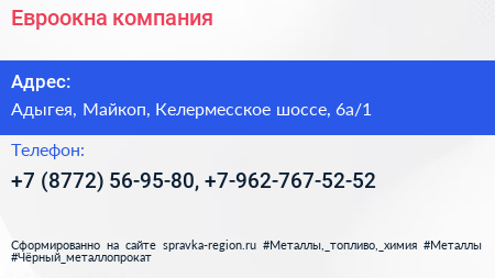 Евроокна, компания по адресу Адыгея, Майкоп, Келермесское шоссе, 6а/1 в дальнейшем Организация, размещена в следующих категориях: