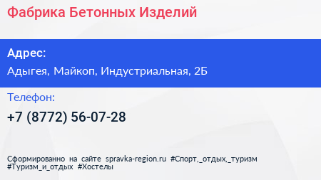 Фабрика Бетонных Изделий по адресу Адыгея, Майкоп, Индустриальная, 2Б в дальнейшем Организация, размещена в следующих категориях:
