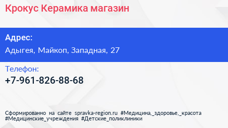 Крокус Керамика, магазин по адресу Адыгея, Майкоп, Западная, 27 в дальнейшем Организация, размещена в следующих категориях: