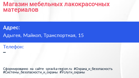 Магазин мебельных лакокрасочных материалов по адресу Адыгея, Майкоп, Транспортная, 15 в дальнейшем Организация, размещена в следующих категориях: