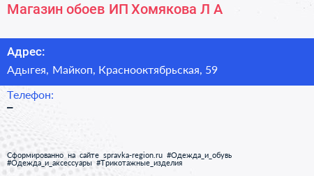 Магазин обоев, ИП Хомякова Л.А. по адресу Адыгея, Майкоп, Краснооктябрьская, 59 в дальнейшем Организация, размещена в следующих категориях: