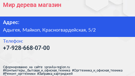 Мир дерева, магазин по адресу Адыгея, Майкоп, Красногвардейская, 5/2 в дальнейшем Организация, размещена в следующих категориях: