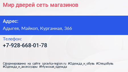 Мир дверей, сеть магазинов по адресу Адыгея, Майкоп, Курганная, 366 в дальнейшем Организация, размещена в следующих категориях:
