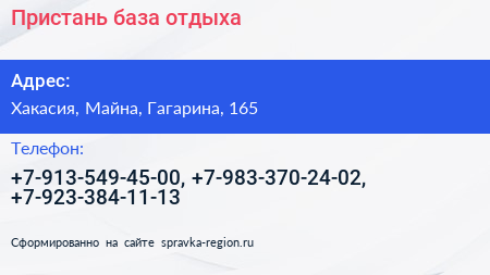 Пристань, база отдыха по адресу Хакасия, Майна, Гагарина, 165 в дальнейшем Организация, размещена в следующих категориях:
