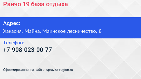 Ранчо 19, база отдыха по адресу Хакасия, Майна, Маинское лесничество, 8 в дальнейшем Организация, размещена в следующих категориях: