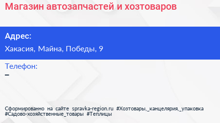 Магазин автозапчастей и хозтоваров по адресу Хакасия, Майна, Победы, 9 в дальнейшем Организация, размещена в следующих категориях:
