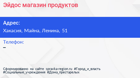 Эйдос, магазин продуктов по адресу Хакасия, Майна, Ленина, 51 в дальнейшем Организация, размещена в следующих категориях: