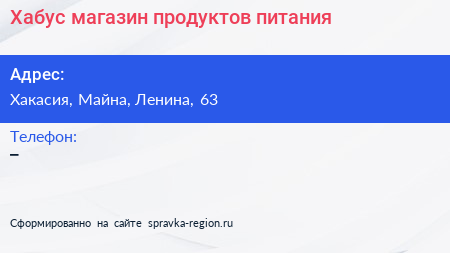 Хабус, магазин продуктов питания по адресу Хакасия, Майна, Ленина, 63 в дальнейшем Организация, размещена в следующих категориях: