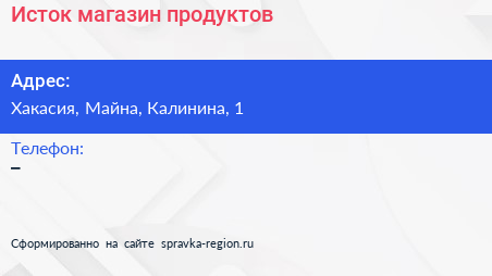 Исток, магазин продуктов по адресу Хакасия, Майна, Калинина, 1 в дальнейшем Организация, размещена в следующих категориях: