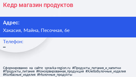 Кедр, магазин продуктов по адресу Хакасия, Майна, Песочная, 6е в дальнейшем Организация, размещена в следующих категориях: