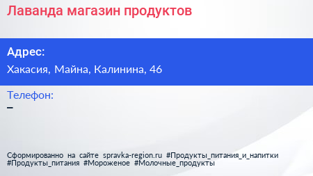 Лаванда, магазин продуктов по адресу Хакасия, Майна, Калинина, 46 в дальнейшем Организация, размещена в следующих категориях: