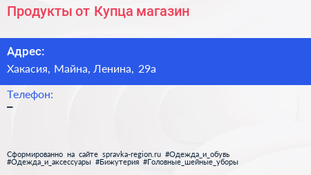 Продукты от Купца, магазин по адресу Хакасия, Майна, Ленина, 29а в дальнейшем Организация, размещена в следующих категориях:
