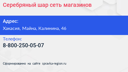 Серебряный шар, сеть магазинов по адресу Хакасия, Майна, Калинина, 46 в дальнейшем Организация, размещена в следующих категориях: