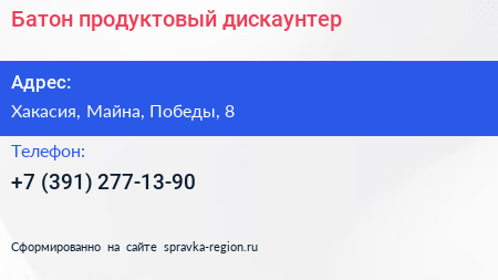 Батон, продуктовый дискаунтер по адресу Хакасия, Майна, Победы, 8 в дальнейшем Организация, размещена в следующих категориях: