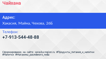 Чайхана по адресу Хакасия, Майна, Чехова, 26Б в дальнейшем Организация, размещена в следующих категориях:
