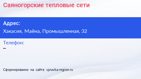 Саяногорские тепловые сети по адресу Хакасия, Майна, Промышленная, 32 в дальнейшем Организация, размещена в следующих категориях: