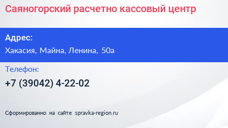 Саяногорский расчетно-кассовый центр по адресу Хакасия, Майна, Ленина, 50а в дальнейшем Организация, размещена в следующих категориях: