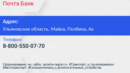 Почта Банк по адресу Ульяновская область, Майна, Полбина, 4а в дальнейшем Организация, размещена в следующих категориях: