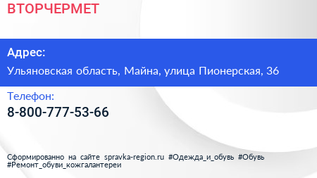 ВТОРЧЕРМЕТ по адресу Ульяновская область, Майна, улица Пионерская, 36 в дальнейшем Организация, размещена в следующих категориях: