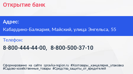 Открытие, банк по адресу Кабардино-Балкария, Майский, улица Энгельса, 55 в дальнейшем Организация, размещена в следующих категориях: