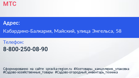 МТС по адресу Кабардино-Балкария, Майский, улица Энгельса, 58 в дальнейшем Организация, размещена в следующих категориях: