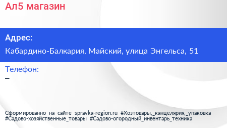 Ал5, магазин по адресу Кабардино-Балкария, Майский, улица Энгельса, 51 в дальнейшем Организация, размещена в следующих категориях:
