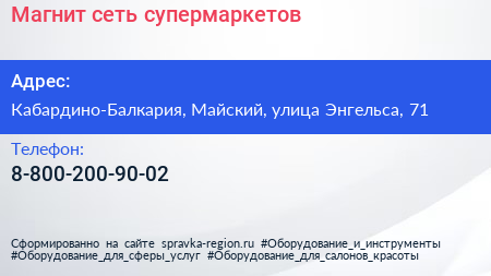 Магнит, сеть супермаркетов по адресу Кабардино-Балкария, Майский, улица Энгельса, 71 в дальнейшем Организация, размещена в следующих категориях: